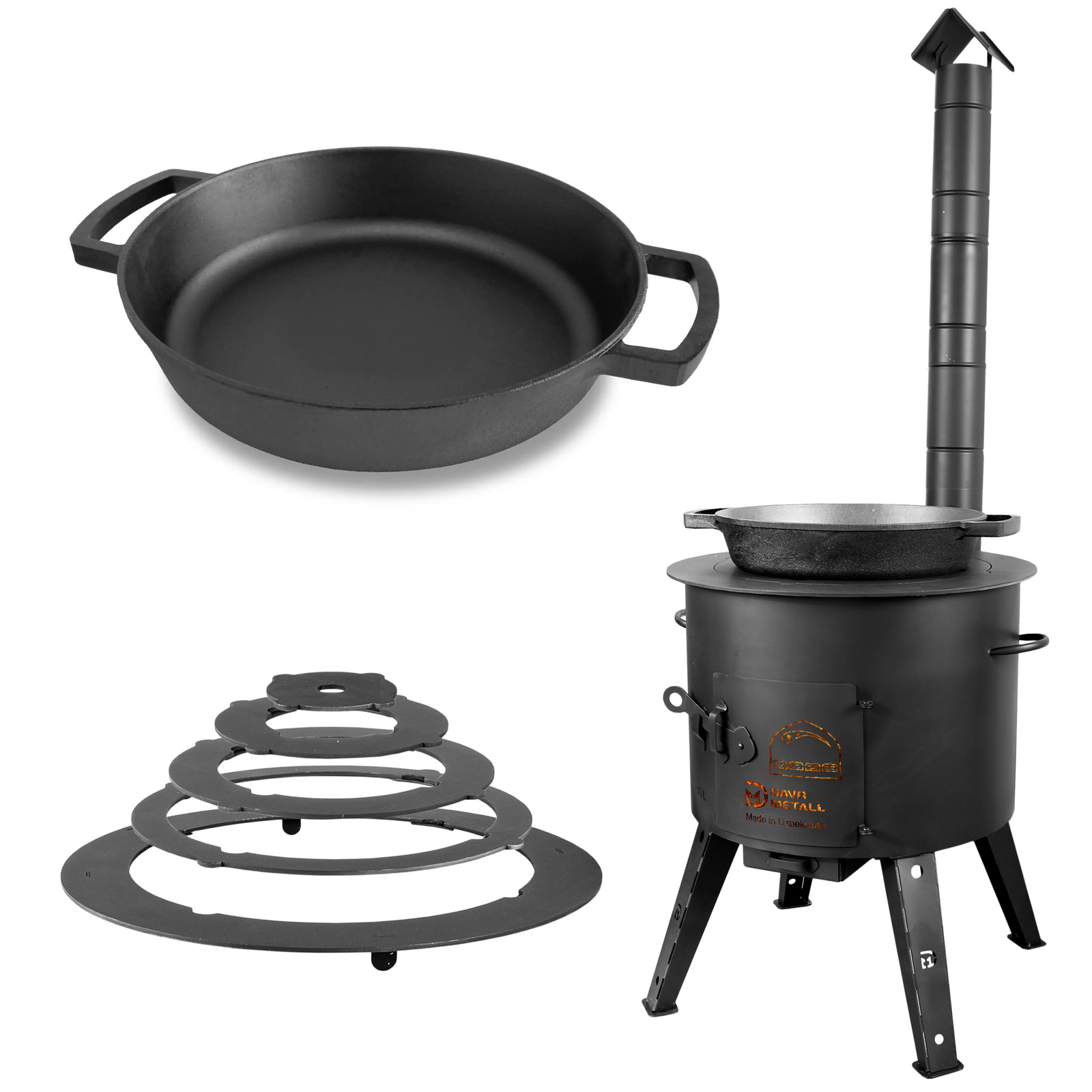 Dieses Set ist nicht nur eine ausgezeichnete Wärmequelle, sondern schafft auch eine Atmosphäre häuslicher Gemütlichkeit. Mit seiner Hilfe können Sie die Wärme des Feuers genießen und köstliche Gerichte im Kessel zubereiten, was Ihre Zeit im Freien unvergesslich macht.