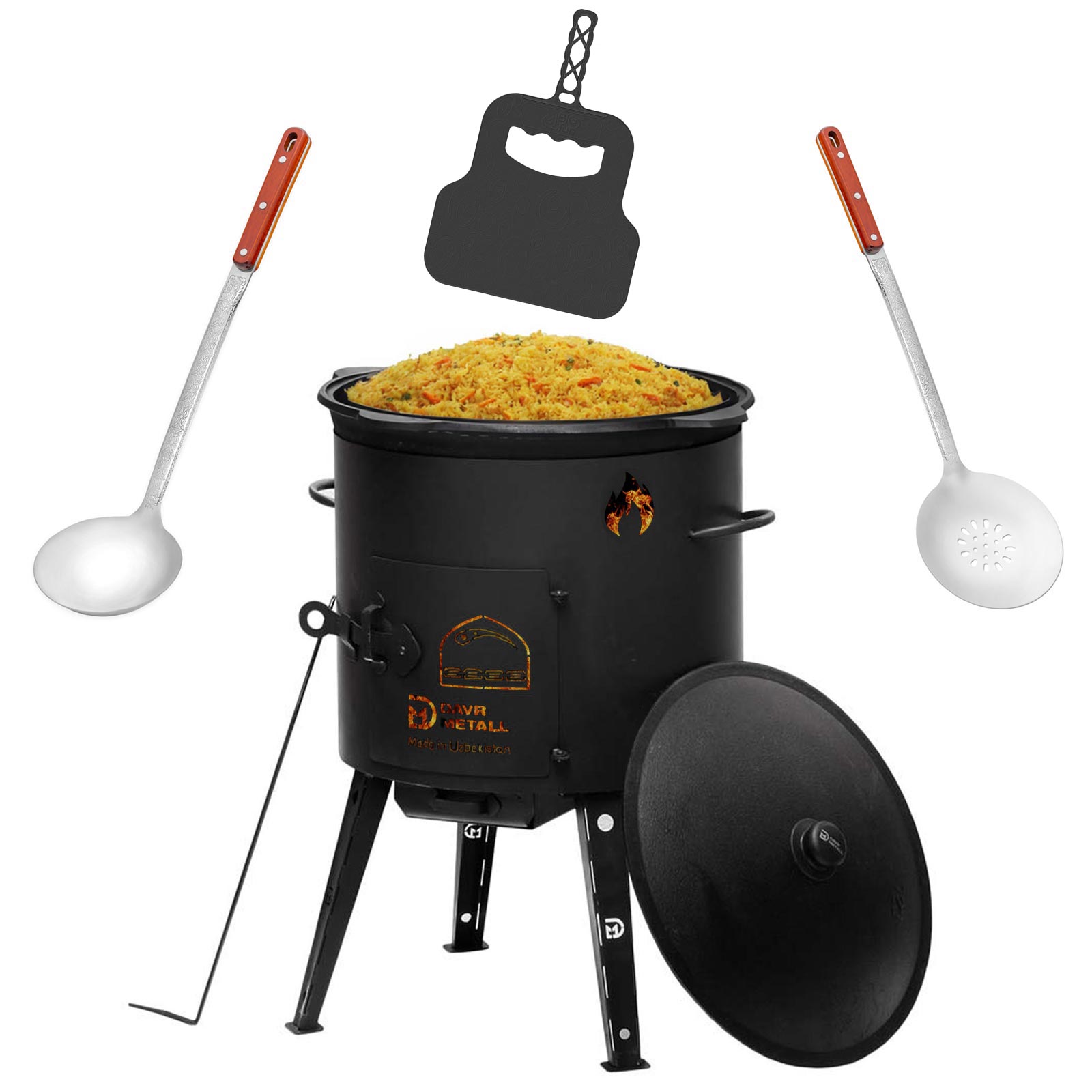Utschag Durchmesser, сm: 49 Höhe Feuerstelle, сm: 35 Höhe Füße, сm: 29 Gesamthöhe, сm: 61 Gewicht, ca. kg: 17 Länge Feuerhaken, cm: 44 Produktmaterial: Stahl 2mm Gusseisen Kasan NAMANGAN Deckel aus Aluminium Durchmesser, cm: 50 Produkthöhe, cm: 19 Volumen, l: 22 Gewicht, kg: ca. 16,7 Wandstärke, mm: 10 Schaumkelle Gesamtlänge: 65 cm  Suppenkelle Gesamtlänge: 62 cm  Grillfächer Maße ca.: 21 x 30 cm