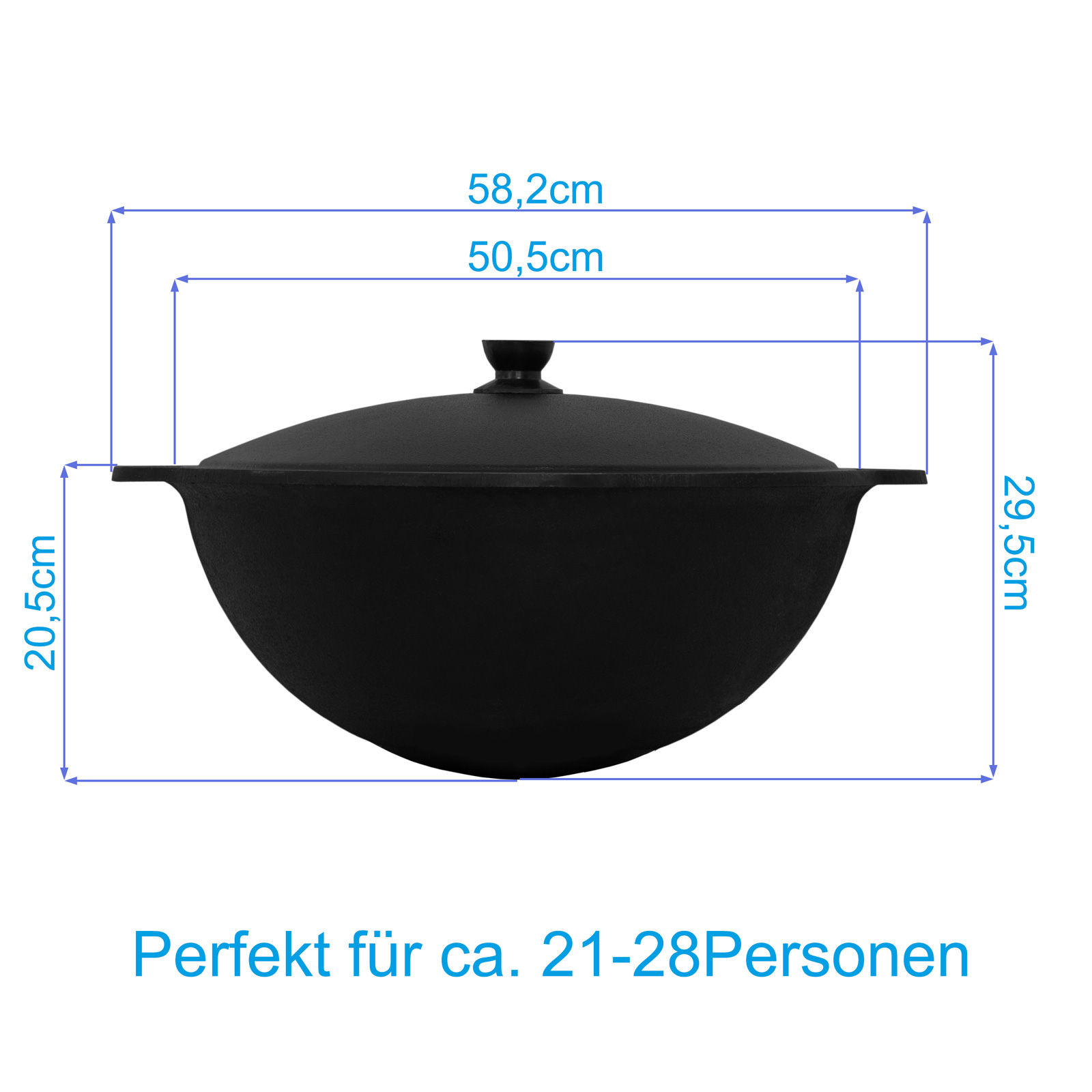 Im Set ist auch ein Kessel aus Gusseisen enthalten, der dem Feuerplatz zusätzliche Funktionalität verleiht. Gusseisen eignet sich hervorragend zum Kochen verschiedener Gerichte, dank seiner gleichmäßigen Erwärmung und Wärmespeicherung. Der Kessel eignet sich zum Dünsten, Braten, Kochen und anderen Kochmethoden.